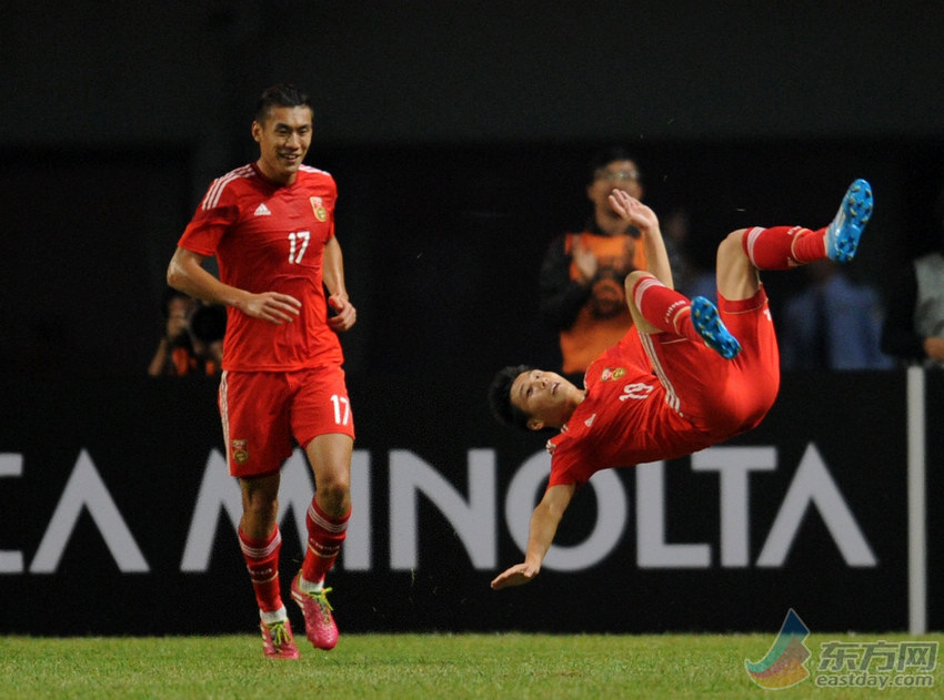 10月14日,中国队球员武磊(右)在比赛中庆祝进球。当日,在湖南长沙贺龙体育场进行的中国之队国际足球友谊赛中,中国队以2比1战胜巴拉圭队。(来源:新华社)