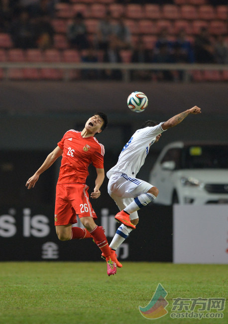 中国队球员梅方(左)在比赛中争顶。(来源:新华社)