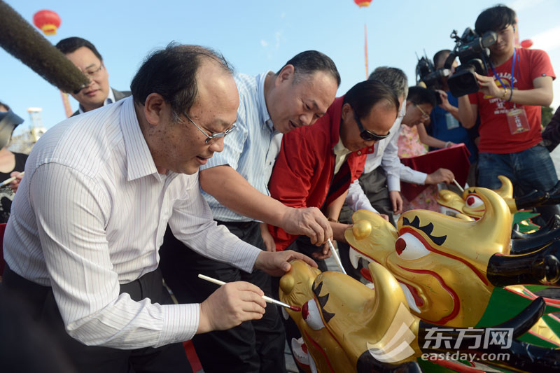 东方网党委书记、董事长何继良(左一)等嘉宾为龙舟点睛。