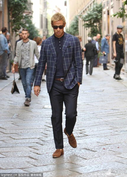 当地时间2014年10月21日,意大利米兰,本田圭佑出街购物,格子外套黑超遮面帅气有型。