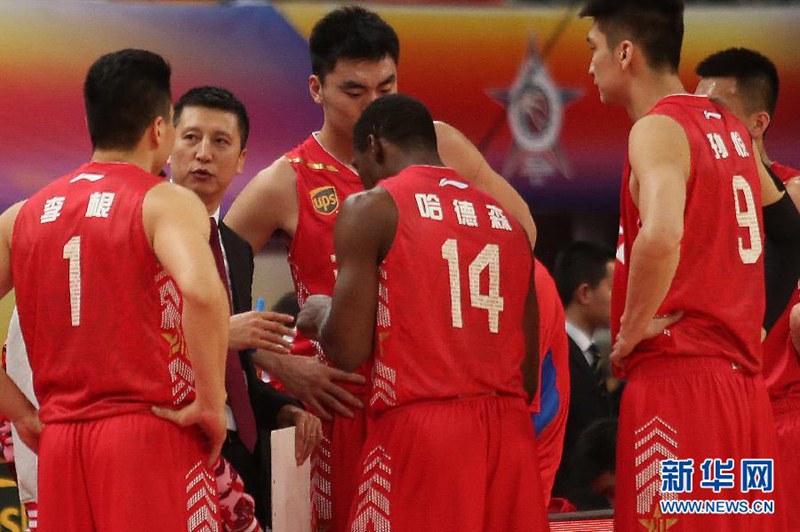 1月18日,北方队主教练郭士强(左二)在场边指导球员。