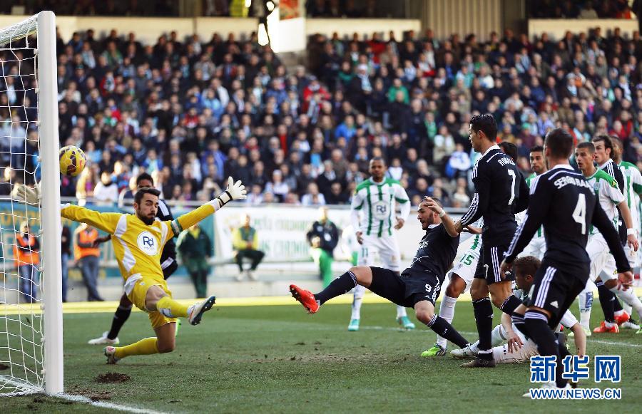 1月24日,皇家马德里队球员本泽马(前左二)在比赛中射门得分。