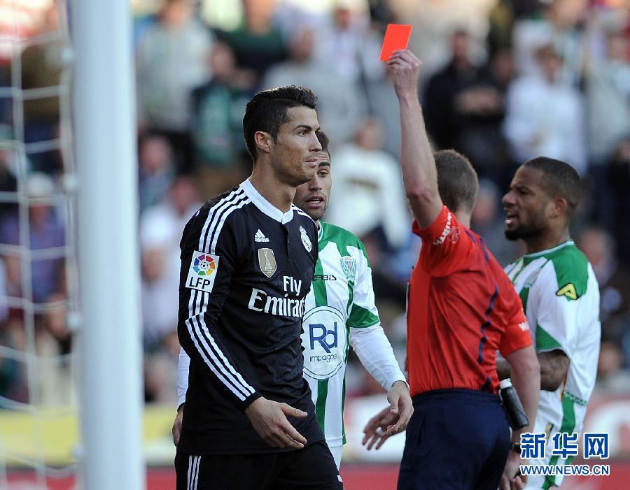 月24日,皇家马德里队球员克里斯蒂亚诺·罗纳尔多(左)在比赛中被出示红牌。
