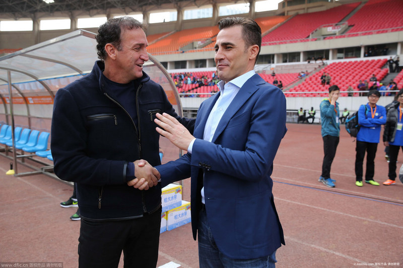 2015年2月14日,杭州,2015中国足协超级杯,90分钟内,广州恒大0-0山东鲁能。点球大战中,恒大黄博文射失。山东鲁能5-3战胜对手捧得超级杯。图为赛前两队寒暄问暖,卡纳瓦罗英姿勃发与库卡热聊。(来源:东方IC 未经权利人许可不得转载)