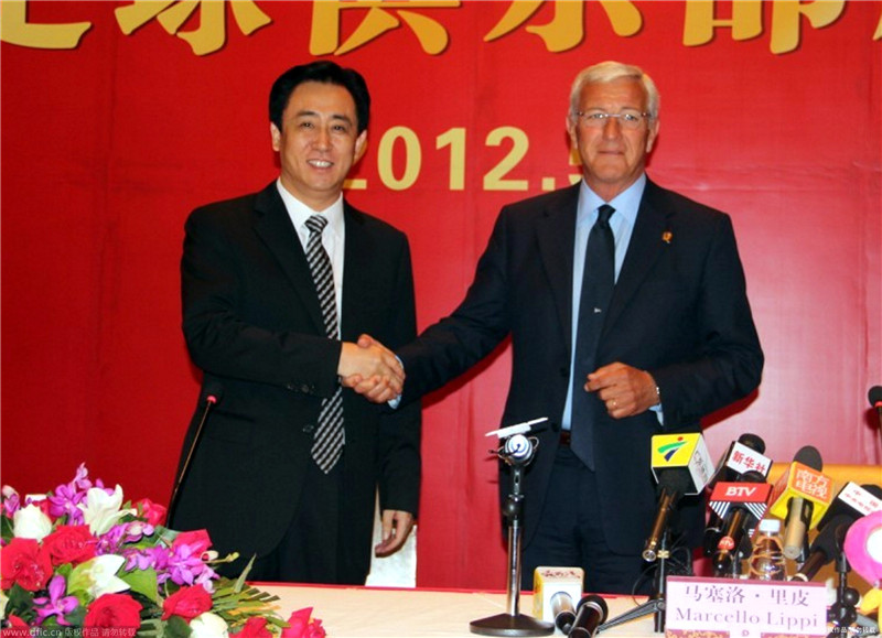 2015年2月25日,广州,由于个人身体及家庭原因,里皮主教练近日向俱乐部申请:提前终止合同。经俱乐部董事会慎重研究决定:同意里皮主教练的辞职申请。现年66岁的里皮于2012年5月17日正式成为广州恒大队主教练,带领球队获得三届中超冠军,一届亚冠冠军和一届足协杯冠军。里皮共带队恒大参加了128场比赛,取得85场胜利,攻入了283球。一起来回顾世界名帅里皮在恒大的光辉岁月。图为2012年5月17日,广州,广州恒大召开记者会,正式签约世界名帅里皮(Marcello Lippi)。