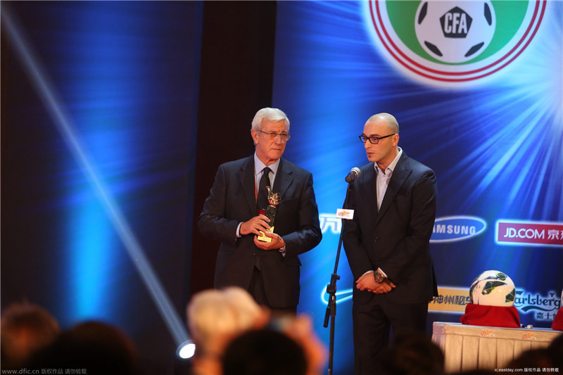 2015年2月25日,广州,由于个人身体及家庭原因,里皮主教练近日向俱乐部申请:提前终止合同。经俱乐部董事会慎重研究决定:同意里皮主教 练的辞职申请。现年66岁的里皮于2012年5月17日正式成为广州恒大队主教练,带领球队获得三届中超冠军,一届亚冠冠军和一届足协杯冠军。里皮共带队 恒大参加了128场比赛,取得85场胜利,攻入了283球。一起来回顾世界名帅里皮在恒大的光辉岁月。图为2013年11月24日,北京,2013年中超颁奖典礼举行,里皮获得2013中超最佳教练。