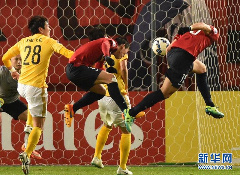 4月7日,鹿岛鹿角队球员高崎宽之(右一)在终场前头球攻门绝杀广州恒大队。