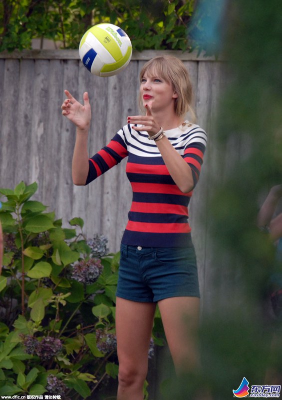 当地时间2012年8月19日,美国海恩尼斯港,近来乡村小天后一直居住在马萨诸塞州,小妮子还在自家花园大玩起排球,非常享受目前的生活。