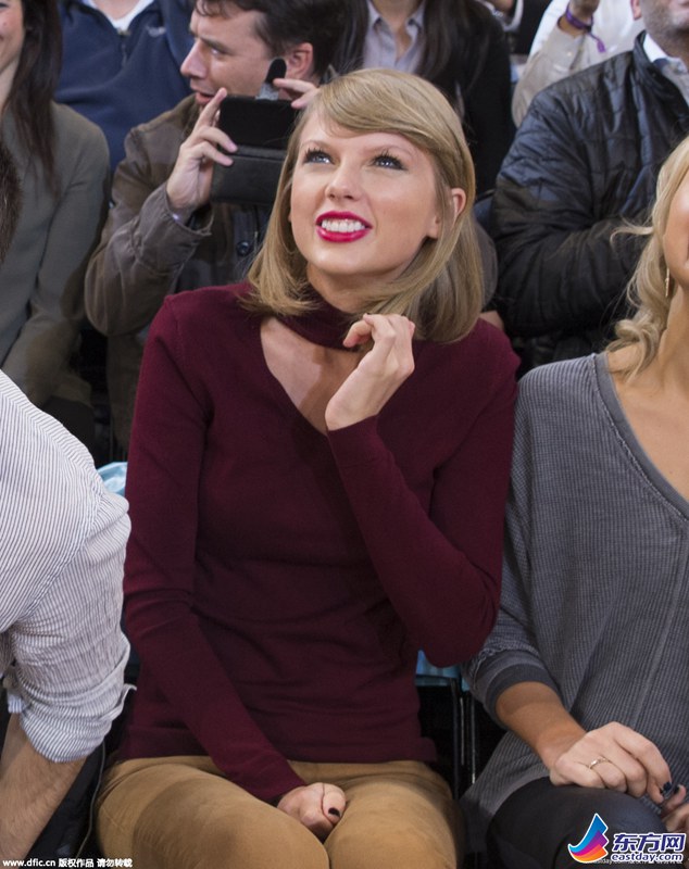 当地时间2014年11月12日,美国纽约,众星观看NBA比赛。泰勒-斯威夫特一脸兴奋超级捧场!