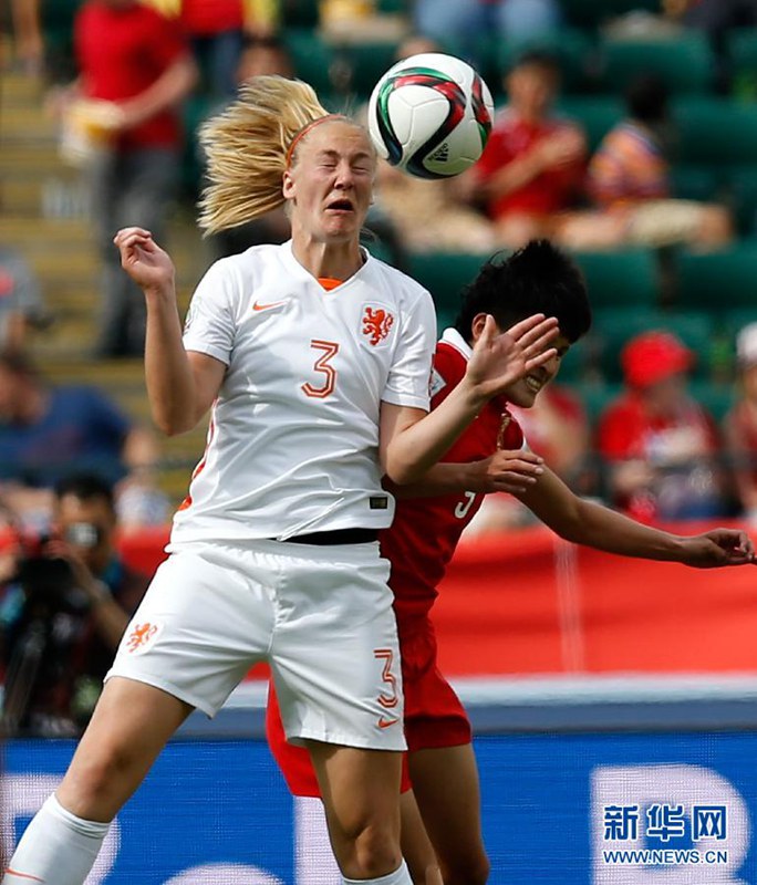 6月11日,中国队球员王珊珊(右)与荷兰队球员斯特凡尼争顶。当日,在加拿大埃德蒙顿英联邦体育场举行的第七届国际足联女足世界杯A组小组赛中,中国队以1比0战胜荷兰队。