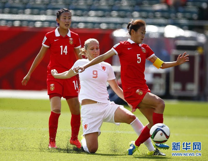 6月11日,中国队队长吴海燕(右)防守荷兰队球员米德马(中)。当日,在加拿大埃德蒙顿英联邦体育场举行的第七届国际足联女足世界杯A组小组赛中,中国队以1比0战胜荷兰队。