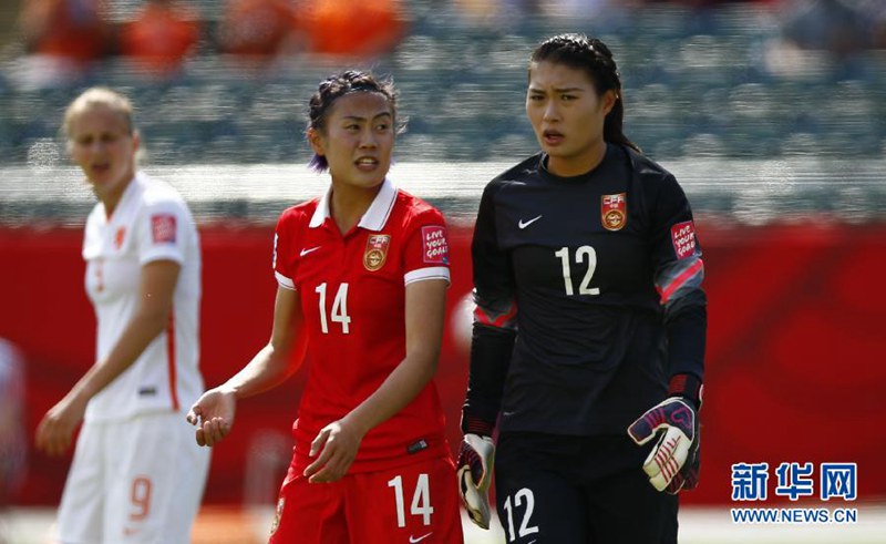 6月11日,中国队守门员王飞(右)在比赛中与队友赵容商讨战术。当日,在加拿大埃德蒙顿英联邦体育场举行的第七届国际足联女足世界杯A组小组赛中,中国队以1比0战胜荷兰队。