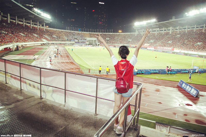 2015中超第13轮,广州恒大VS天津泰达。丢丢站在看台上张开双臂,享受足球带给她的美好。