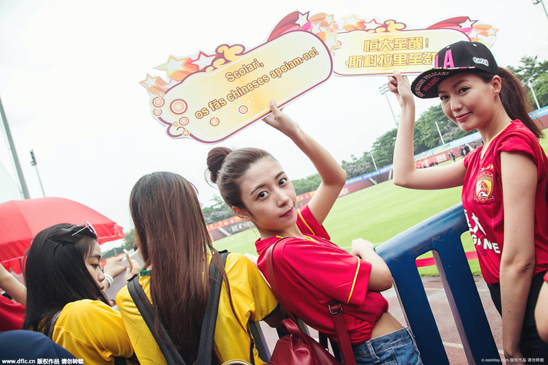 恒大新帅斯科拉里上任后的首次公开训练课,作为恒大铁杆粉的丢丢(右二)现身场边,与球员互动。