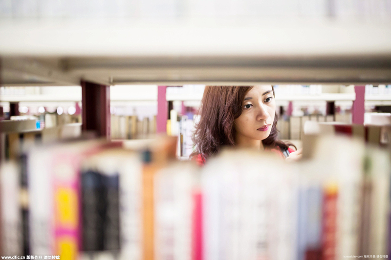 丢丢在图书馆里认真的寻找自己喜欢的图书。