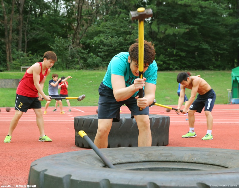 韩国首尔,韩国拳击队为了仁川亚运会正在积极训练。运动员用锤子击打轮胎练习力量。