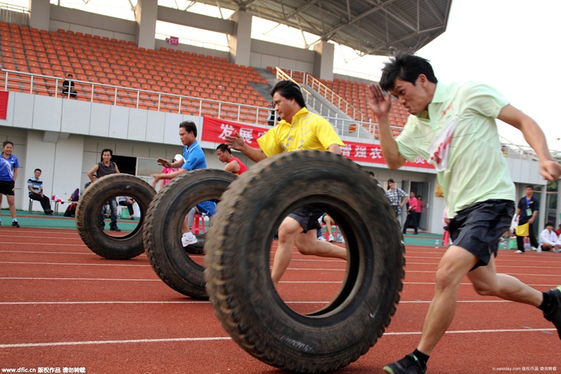 海南海口,农民工运动员在进行推轮胎田径比赛。当天,海南省首届农民运动会在海南省高级体校举行推轮胎、担运粮食特定田径比赛。
