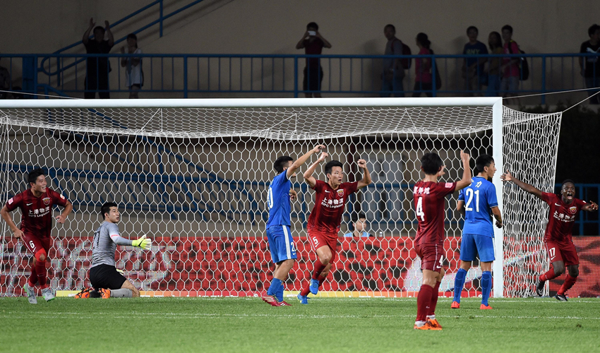 中超:上海上港胜广州富力,7月12日,上海上港队球员汪佳捷(左四)庆祝进球当日,在2015年中超联赛第18轮比赛中,上海上港队客场以3比2战胜广州富力队。