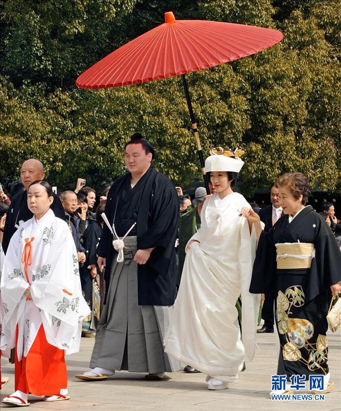 2010年2月21日,蒙古国出生的相扑横纲白鹏在日本东京举行婚礼。图为白鹏(右三)和新娘一起走入婚礼现场.