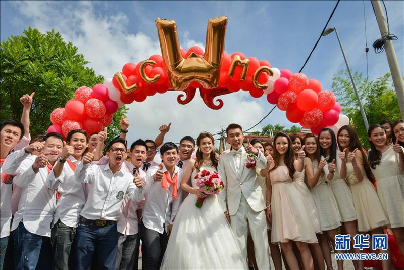 2012年11月10日,马来西亚羽毛球名将李宗伟与马来西亚前女单一号黄妙珠举行华人礼俗的婚礼。图为李宗伟和妻子黄妙珠在婚礼仪式上与伴郎伴娘合影。
