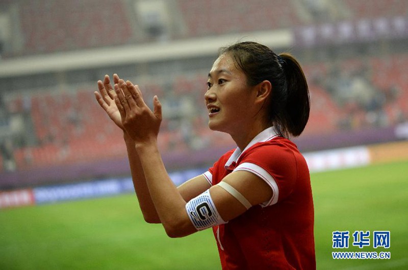 9月18日,中国女足队长吴海燕在比赛后向球迷致意。