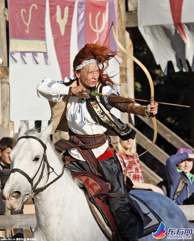 当地时间2015年10月3日,乌克兰,乌克兰民众身着复古服饰庆传统节日,一展精湛骑术与射术。
