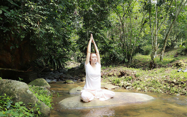 胡静林间做瑜伽