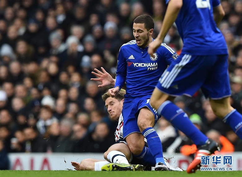 11月29日,切尔西队球员阿扎尔(中)在比赛中拼抢。