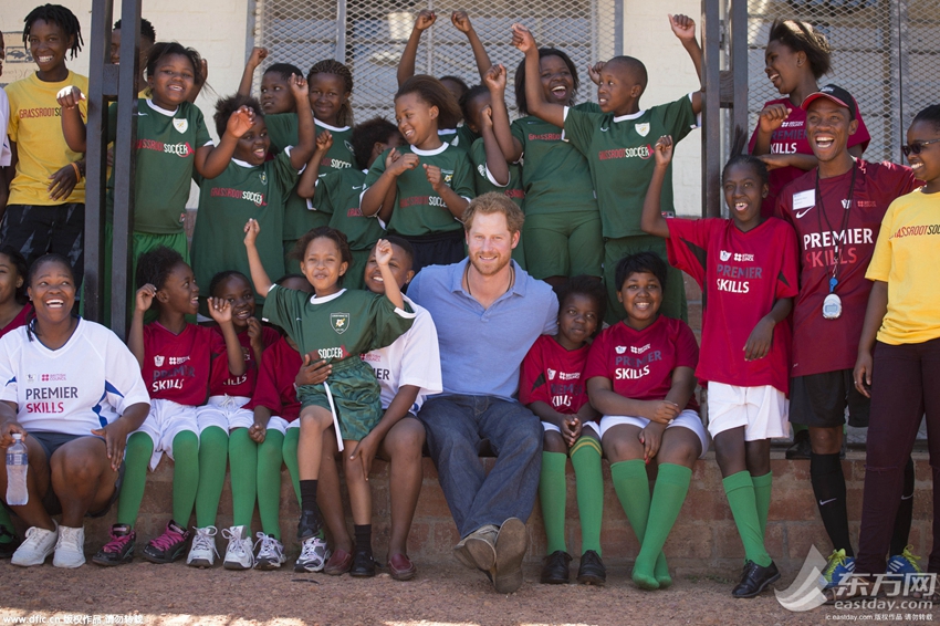 地时间2015年11月30日,南非开普敦,哈里王子访问南非,参观足球希望中心小秀球技。
