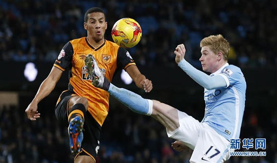 12月1日,曼城队球员德布劳内(右)与赫尔城队球员海登在比赛中争抢。