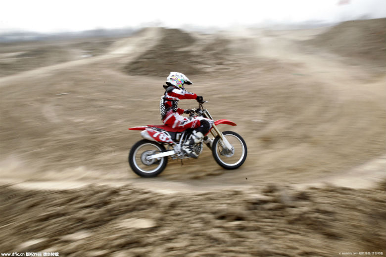 2016年1月27日,河南省郑州市古荥镇一片荒野上,数名越野摩托骑手在一块赛车场地中上下翻飞,相互追逐着。用于越野飞车的场地是一块约50亩,合3万多平方米的荒地,场地内的赛道高低起伏,壕沟加回转等颇有些国际赛道的范儿。“这块越野场地,是村里的朋友开推土机,花了近半个月时间打造的!”摩托车发烧友小李告诉记者。“在场地中玩儿的,都是附近村里喜欢越野摩托的练家子,更有一些资深玩家几乎每天来练车,为年后一些国内的比赛做热身”。