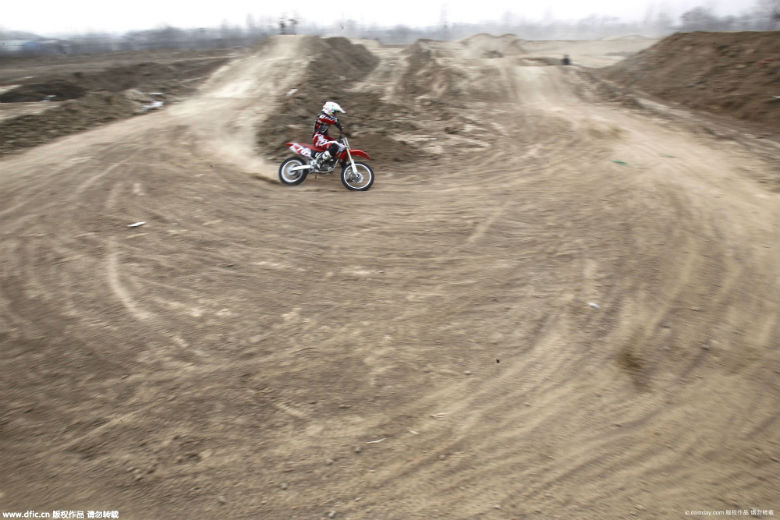 2016年1月27日,河南省郑州市古荥镇一片荒野上,数名越野摩托骑手在一块赛车场地中上下翻飞,相互追逐着。用于越野飞车的场地是一块约50亩,合3万多平方米的荒地,场地内的赛道高低起伏,壕沟加回转等颇有些国际赛道的范儿。“这块越野场地,是村里的朋友开推土机,花了近半个月时间打造的!”摩托车发烧友小李告诉记者。“在场地中玩儿的,都是附近村里喜欢越野摩托的练家子,更有一些资深玩家几乎每天来练车,为年后一些国内的比赛做热身”。