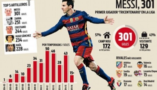 图解梅西300球:专克皇马马竞 领先C罗59球