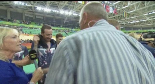 雷德格拉夫还把自己的刁蛮用在了自行车的比赛解说当中,布拉德利-维金斯爵士为英国自行车队夺得团体追逐赛的金牌之后,BBC女记者吉尔-道格拉斯正在对这位自行车运动员进行采访。就在采访正在进行、BBC正在进行现场直播的时候,雷德格拉夫居然冲了过来直接和维金斯拥抱庆祝。正在采访的道格拉斯立即对着雷德格拉夫说道:“请让我完成自己的工作!”