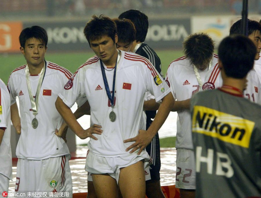 2004年,中国第一次举办亚洲杯,凭借东道主优势杀入决赛,只可惜最终1-3不敌日本,继1984年后再次屈居亚军。图为2004年8月7日,在北京进行的亚洲杯冠亚军决赛的争夺中,中国队以1-3负于日本,屈居亚洲杯亚军。孙祥,邵佳一