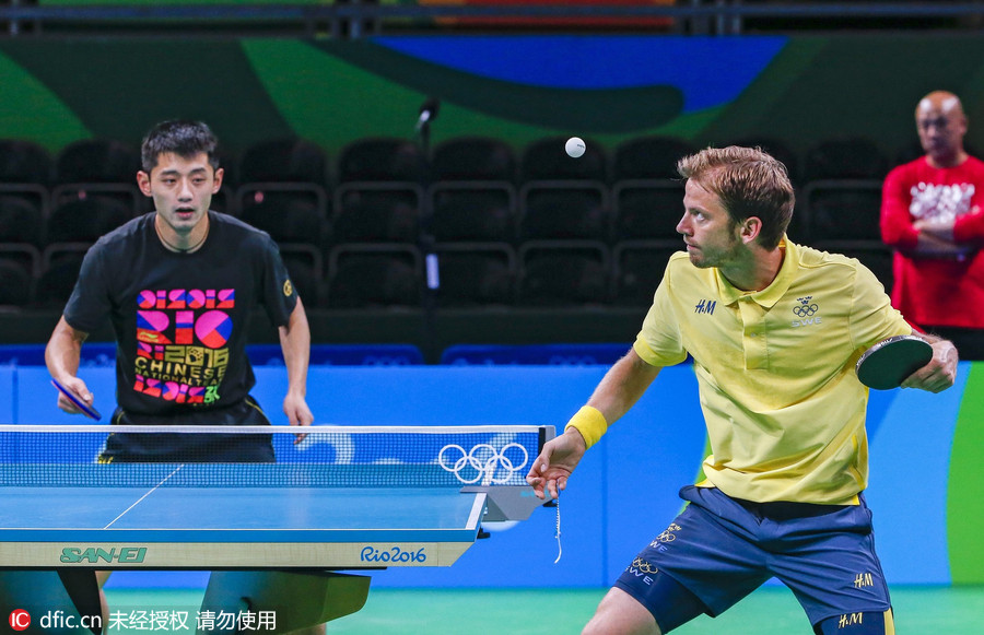 当地时间2016年8月3日,巴西里约热内卢,2016里约奥运会前瞻,中国乒乓球队训练备战,马龙、张继科、李晓霞、刘诗雯上场热身。