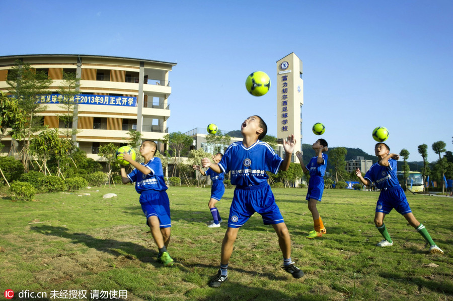 图为2013年9月18日,探营由广州富力地产集团与英国切尔西足球俱乐部重金打造的富力切尔西足球学校。迄今为止,学校已从1300多名小球员中进行了严格选拔,最终,200名球员获得入学资格。小学员在绿茵场上练习顶球。