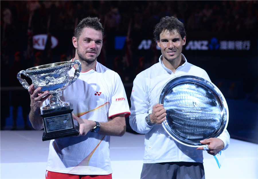1月26日,冠军、瑞士选手瓦林卡(左)和亚军、西班牙选手纳达尔在颁奖仪式上合影。当日,在墨尔本举行的2014年澳大利亚网球公开赛男单决赛中,瑞士选手瓦林卡以3比1战胜西班牙选手纳达尔,获得冠军。