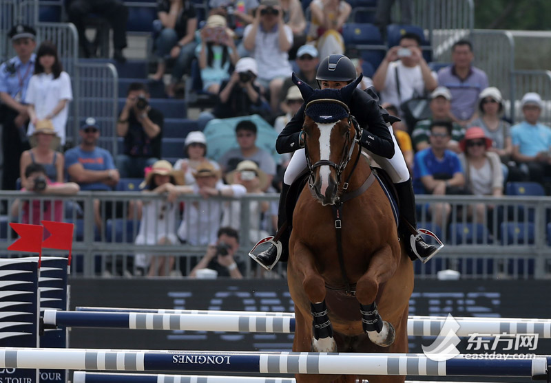 6月6日-8日,2014年上海浪琴环球马术冠军赛在上海地标性建筑中华艺术宫正南的赛场内拉开序幕。这是这项五星级马术赛事首次登陆中国。赛场内外,美女、豪车、游艇,所有围绕这场“高大上”赛事的花絮以及骏马和优雅的骑师为上海观众呈献了一场顶级视觉盛宴。图为骑手驾驭宝马纵身一跃。