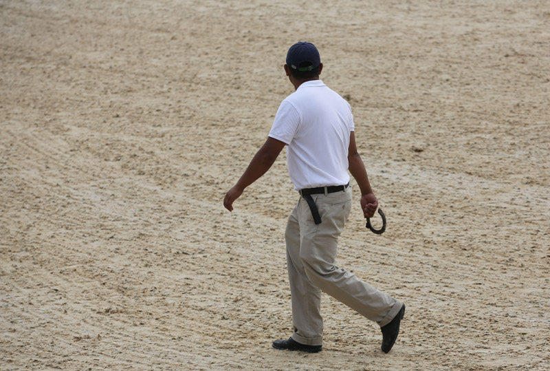 6月6日-8日,2014年上海浪琴环球马术冠军赛在上海地标性建筑中华艺术宫正南的赛场内拉开序幕。这是这项五星级马术赛事首次登陆中国。赛场内外,美女、豪车、游艇,所有围绕这场“高大上”赛事的花絮以及骏马和优雅的骑师为上海观众呈献了一场顶级视觉盛宴。图为工作人员在赛场里捡起马儿掉落的马掌。