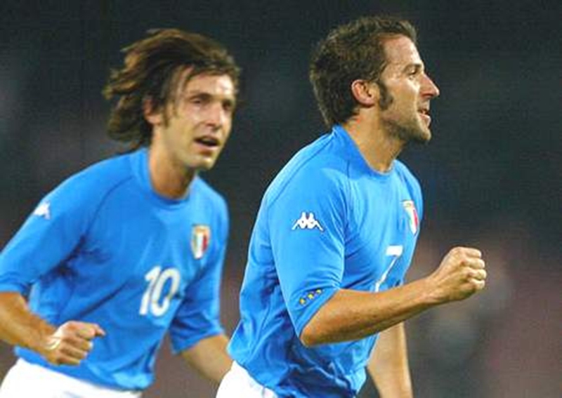 2002年10月12日,对于皮尔洛来说无疑是一个终身难忘的日子。这一天,皮尔洛第一次代表意大利成年国家队走进球场——是在那座曾经被马拉多纳统治、球场气氛极度狂热的那不勒斯圣保罗球场,而首次为国出战的皮尔洛身上穿的就是那件拥有着传奇色彩的10号战袍。在那场欧洲杯预选赛中,意大利1-1与前南斯拉夫战平,皮尔洛的表现获得交口称颂,意大利媒体纷纷表示蓝衣军团未来的中流砥柱横空出世。