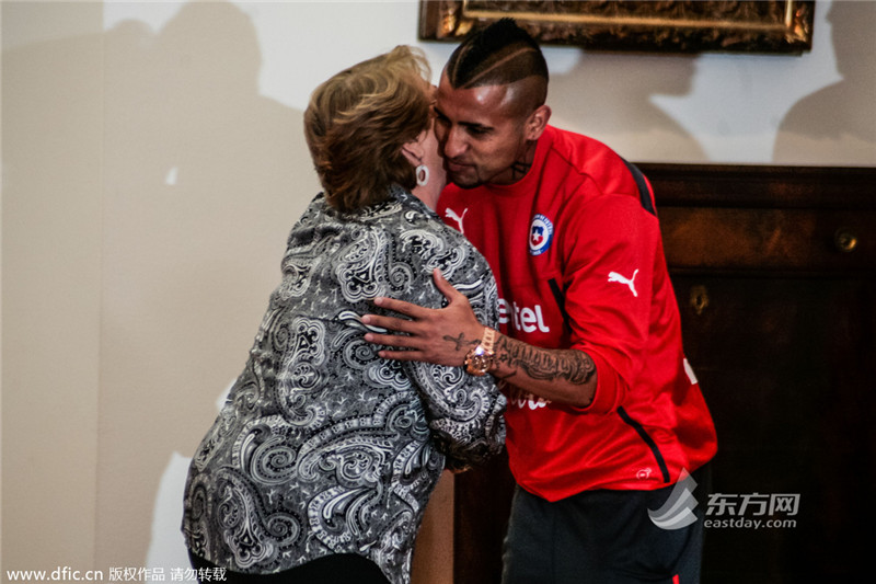 当地时间2014年6月29日,智利首都圣地亚哥,虽然止步1/8决赛,但是智利国家队今年世界杯的表现征服了很多人。球队回国后受到了总统的接见,随后在总统府邸的阳台上接受了智利民众的膜拜。(来源:东方IC 未经许可不得转载) >>>点击进入2014世界杯专题页面