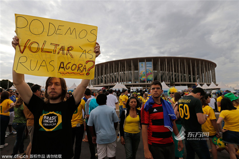 当地时间2014年7月12日,巴西利亚国家体育场,2014巴西世界杯三、四名决赛,巴西0-3荷兰。球迷打出标语:现在我们是要回街道上踢球?(来源:东方IC 未经许可不得转载)>>>点击进入2014年巴西世界杯专题