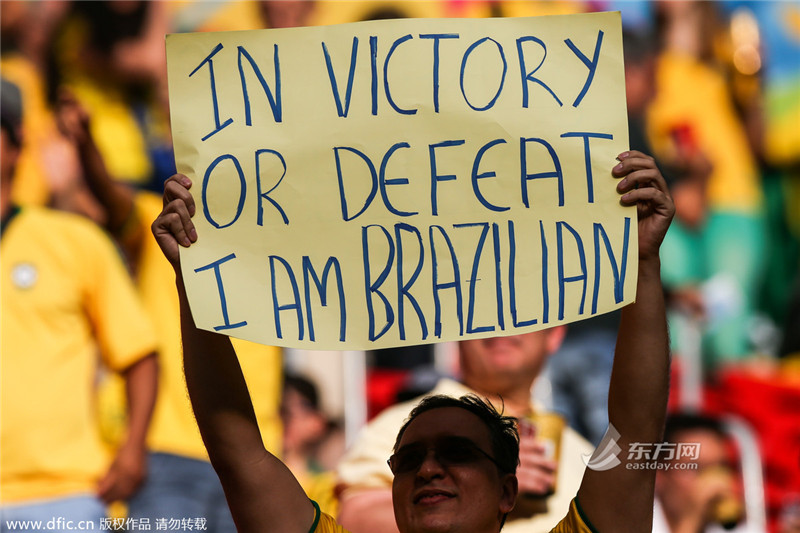 当地时间2014年7月12日,巴西利亚国家体育场,2014巴西世界杯三、四名决赛,巴西0-3荷兰。球迷打出标语:无论胜利还是失败,我都是巴西人。(来源:东方IC 未经许可不得转载)>>>点击进入2014年巴西世界杯专题
