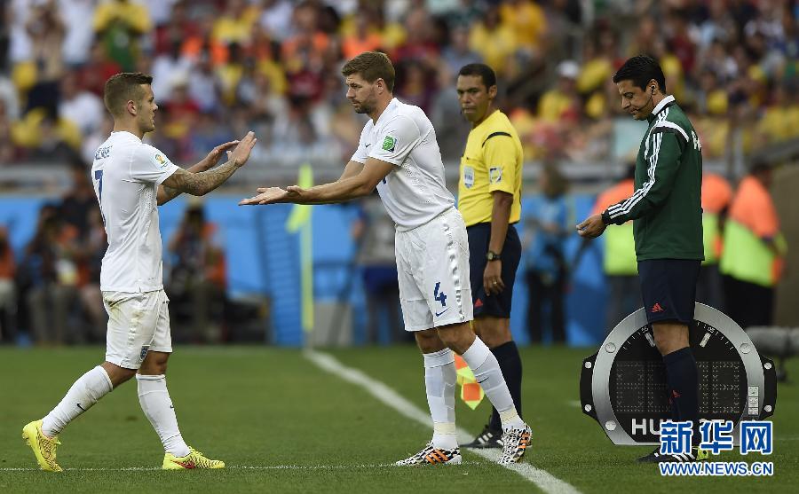 图为2014年6月24日,杰拉德(中)在巴西世界杯小组赛D组与哥斯达黎加队比赛中替换队友杰·威尔谢尔(左一)上场。