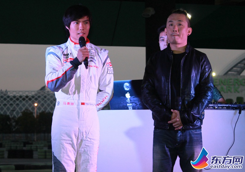 10月8日,首届马青骅卡丁车杯在2062卡丁车俱乐部举行,庆祝2014赛季世界房车锦标赛(WTCC)新一分站将在上海打响。马青骅与为WTCC雪铁龙车队另三位车手一同上场,为车迷献上一场热闹的表演赛。图为:马青骅和“王厂长”王昊
