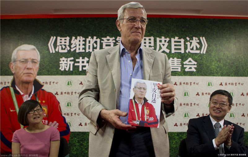 2015年2月25日,广州,由于个人身体及家庭原因,里皮主教练近日向俱乐部申请:提前终止合同。经俱乐部董事会慎重研究决定:同意里皮主教 练的辞职申请。现年66岁的里皮于2012年5月17日正式成为广州恒大队主教练,带领球队获得三届中超冠军,一届亚冠冠军和一届足协杯冠军。里皮共带队 恒大参加了128场比赛,取得85场胜利,攻入了283球。一起来回顾世界名帅里皮在恒大的光辉岁月。图为2014年5月22日,广州,里皮出席新书《思维的竞赛:里皮自述》发布会。