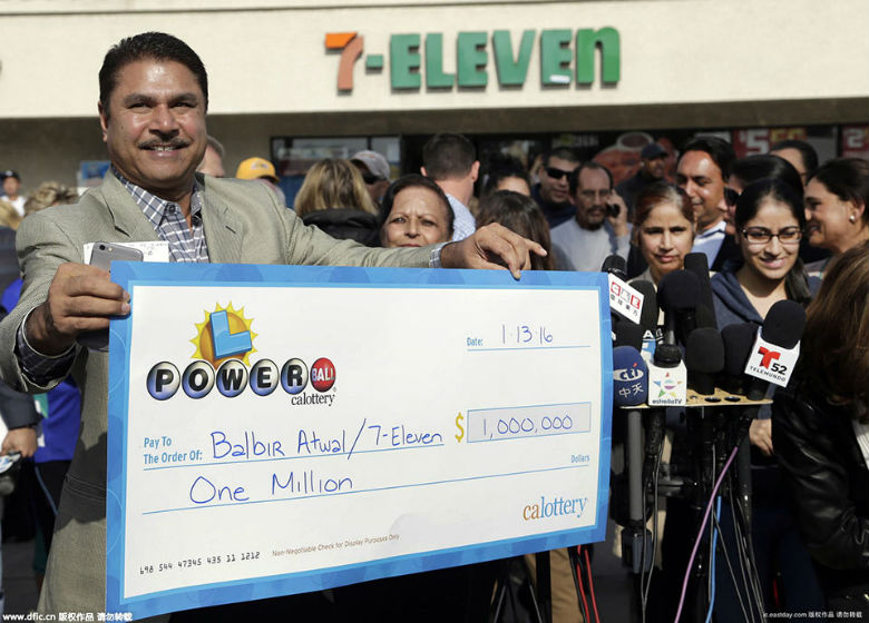 当地时间2016年1月14日,美国加州,美国头奖奖池达15亿美元的强力球彩票头奖号码已有人买中,该张彩票的售出地为加利福尼亚州奇诺岗的一家7-11便利店。图为便利店店主BalbirAtwal出席新闻发布会,他获得100万美元的奖金。