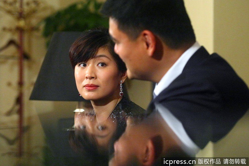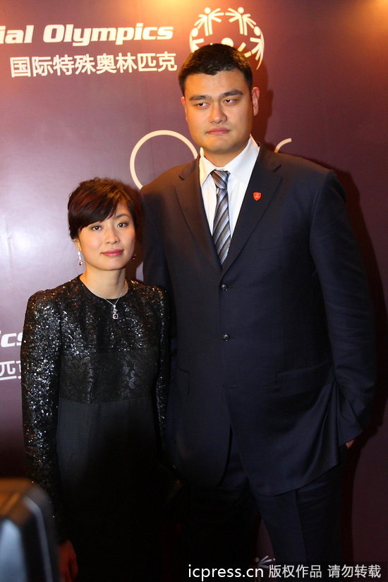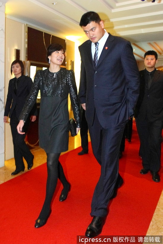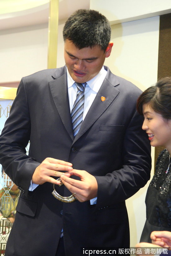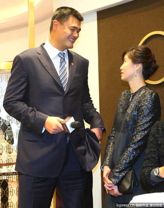 姚老板携妻子出席时尚签约活动 姚明夫妇试带珠宝戒指