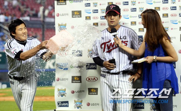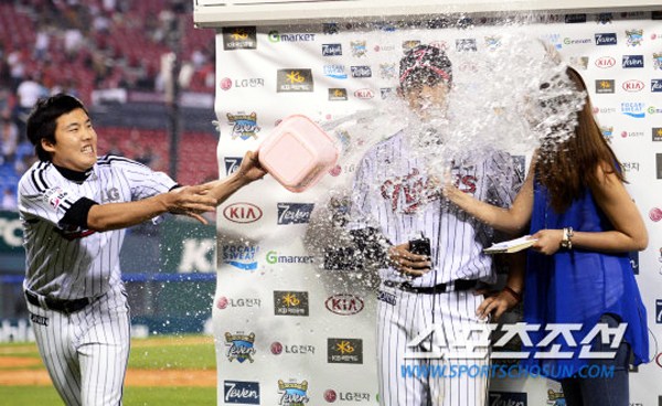据韩国《朝鲜日报》报道,26日,在首尔蚕室棒球场举行的2013职业棒球赛SK队对阵LG队的比赛结束后,当选手郑义润接受主持人郑仁英(音)的采访时,队友任灿圭突然上前泼水。虽然这一举动是对以最后一记安打挽救球队的队友郑义润的祝贺,但站在旁边的郑仁英却湿得更透彻。(来源:中新网)